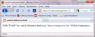 <html> <head> <title>contoh dokumen html</title> </head> <body> Hello World! Ini contoh dokumen html saya. Saya seorang new bie. Mohon bantuannya. </body> </html>Jika dilihat menggunakan web browser maka hasilnya akan menjadi berikut :
